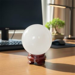 Quả cầu Canxit trắng nổi bật với màu trắng tinh khiết và độ sáng bóng cao. Màu trắng của đá Canxit không chỉ mang lại sự trang nhã, nhẹ nhàng mà còn tượng trưng cho sự thuần khiết và sự đổi mới.
